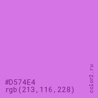Цвет #D574E4 в цветовой модели RGB обозначается тремя октетами (213, 116, 228) в десятичном формате и #D574E4 в шестнадцатиричном (hex) формате, которые являются интенсивностью красного 213 (hex D5), интенсивность зелёного 116 (hex 74) и интенсивность синего 228 (hex E4).