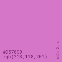 Цвет #D576C9 в цветовой модели RGB обозначается тремя октетами (213, 118, 201) в десятичном формате и #D576C9 в шестнадцатиричном (hex) формате, которые являются интенсивностью красного 213 (hex D5), интенсивность зелёного 118 (hex 76) и интенсивность синего 201 (hex C9).