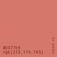 Цвет #D57769 в цветовой модели RGB обозначается тремя октетами (213, 119, 105) в десятичном формате и #D57769 в шестнадцатиричном (hex) формате, которые являются интенсивностью красного 213 (hex D5), интенсивность зелёного 119 (hex 77) и интенсивность синего 105 (hex 69).
