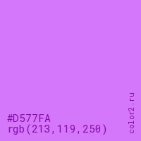 Цвет #D577FA в цветовой модели RGB обозначается тремя октетами (213, 119, 250) в десятичном формате и #D577FA в шестнадцатиричном (hex) формате, которые являются интенсивностью красного 213 (hex D5), интенсивность зелёного 119 (hex 77) и интенсивность синего 250 (hex FA).