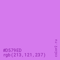 Цвет #D579ED в цветовой модели RGB обозначается тремя октетами (213, 121, 237) в десятичном формате и #D579ED в шестнадцатиричном (hex) формате, которые являются интенсивностью красного 213 (hex D5), интенсивность зелёного 121 (hex 79) и интенсивность синего 237 (hex ED).