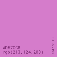 Цвет #D57CCB в цветовой модели RGB обозначается тремя октетами (213, 124, 203) в десятичном формате и #D57CCB в шестнадцатиричном (hex) формате, которые являются интенсивностью красного 213 (hex D5), интенсивность зелёного 124 (hex 7C) и интенсивность синего 203 (hex CB).