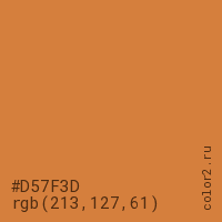 Цвет #D57F3D в цветовой модели RGB обозначается тремя октетами (213, 127, 61) в десятичном формате и #D57F3D в шестнадцатиричном (hex) формате, которые являются интенсивностью красного 213 (hex D5), интенсивность зелёного 127 (hex 7F) и интенсивность синего 61 (hex 3D).
