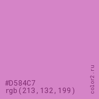 Цвет #D584C7 в цветовой модели RGB обозначается тремя октетами (213, 132, 199) в десятичном формате и #D584C7 в шестнадцатиричном (hex) формате, которые являются интенсивностью красного 213 (hex D5), интенсивность зелёного 132 (hex 84) и интенсивность синего 199 (hex C7).