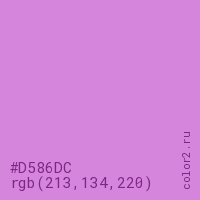 Цвет #D586DC в цветовой модели RGB обозначается тремя октетами (213, 134, 220) в десятичном формате и #D586DC в шестнадцатиричном (hex) формате, которые являются интенсивностью красного 213 (hex D5), интенсивность зелёного 134 (hex 86) и интенсивность синего 220 (hex DC).