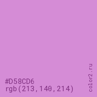 Цвет #D58CD6 в цветовой модели RGB обозначается тремя октетами (213, 140, 214) в десятичном формате и #D58CD6 в шестнадцатиричном (hex) формате, которые являются интенсивностью красного 213 (hex D5), интенсивность зелёного 140 (hex 8C) и интенсивность синего 214 (hex D6).