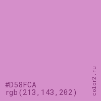 Цвет #D58FCA в цветовой модели RGB обозначается тремя октетами (213, 143, 202) в десятичном формате и #D58FCA в шестнадцатиричном (hex) формате, которые являются интенсивностью красного 213 (hex D5), интенсивность зелёного 143 (hex 8F) и интенсивность синего 202 (hex CA).
