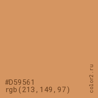 Цвет #D59561 в цветовой модели RGB обозначается тремя октетами (213, 149, 97) в десятичном формате и #D59561 в шестнадцатиричном (hex) формате, которые являются интенсивностью красного 213 (hex D5), интенсивность зелёного 149 (hex 95) и интенсивность синего 97 (hex 61).