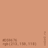 Цвет #D59676 в цветовой модели RGB обозначается тремя октетами (213, 150, 118) в десятичном формате и #D59676 в шестнадцатиричном (hex) формате, которые являются интенсивностью красного 213 (hex D5), интенсивность зелёного 150 (hex 96) и интенсивность синего 118 (hex 76).