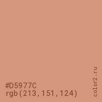Цвет #D5977C в цветовой модели RGB обозначается тремя октетами (213, 151, 124) в десятичном формате и #D5977C в шестнадцатиричном (hex) формате, которые являются интенсивностью красного 213 (hex D5), интенсивность зелёного 151 (hex 97) и интенсивность синего 124 (hex 7C).