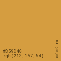 Цвет #D59D40 в цветовой модели RGB обозначается тремя октетами (213, 157, 64) в десятичном формате и #D59D40 в шестнадцатиричном (hex) формате, которые являются интенсивностью красного 213 (hex D5), интенсивность зелёного 157 (hex 9D) и интенсивность синего 64 (hex 40).