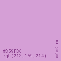 Цвет #D59FD6 в цветовой модели RGB обозначается тремя октетами (213, 159, 214) в десятичном формате и #D59FD6 в шестнадцатиричном (hex) формате, которые являются интенсивностью красного 213 (hex D5), интенсивность зелёного 159 (hex 9F) и интенсивность синего 214 (hex D6).