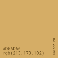 Цвет #D5AD66 в цветовой модели RGB обозначается тремя октетами (213, 173, 102) в десятичном формате и #D5AD66 в шестнадцатиричном (hex) формате, которые являются интенсивностью красного 213 (hex D5), интенсивность зелёного 173 (hex AD) и интенсивность синего 102 (hex 66).