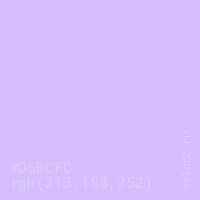 Цвет RGB(213, 188, 252) в процентом отношении количества цвета состоит из 83.5% красного (red), 73.7% зелёного (green) и 98.8% синего (blue).