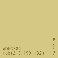 Цвет #D5C784 в цветовой модели RGB обозначается тремя октетами (213, 199, 132) в десятичном формате и #D5C784 в шестнадцатиричном (hex) формате, которые являются интенсивностью красного 213 (hex D5), интенсивность зелёного 199 (hex C7) и интенсивность синего 132 (hex 84).