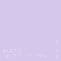 Цвет RGB(213, 199, 236) в процентом отношении количества цвета состоит из 83.5% красного (red), 78% зелёного (green) и 92.5% синего (blue).