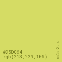 Цвет #D5DC64 в цветовой модели RGB обозначается тремя октетами (213, 220, 100) в десятичном формате и #D5DC64 в шестнадцатиричном (hex) формате, которые являются интенсивностью красного 213 (hex D5), интенсивность зелёного 220 (hex DC) и интенсивность синего 100 (hex 64).