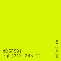 Цвет #D5F501 в цветовой модели RGB обозначается тремя октетами (213, 245, 1) в десятичном формате и #D5F501 в шестнадцатиричном (hex) формате, которые являются интенсивностью красного 213 (hex D5), интенсивность зелёного 245 (hex F5) и интенсивность синего 1 (hex 01).