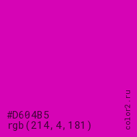 Цвет #D604B5 в цветовой модели RGB обозначается тремя октетами (214, 4, 181) в десятичном формате и #D604B5 в шестнадцатиричном (hex) формате, которые являются интенсивностью красного 214 (hex D6), интенсивность зелёного 4 (hex 04) и интенсивность синего 181 (hex B5).