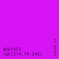 Цвет #D613F2 в цветовой модели RGB обозначается тремя октетами (214, 19, 242) в десятичном формате и #D613F2 в шестнадцатиричном (hex) формате, которые являются интенсивностью красного 214 (hex D6), интенсивность зелёного 19 (hex 13) и интенсивность синего 242 (hex F2).
