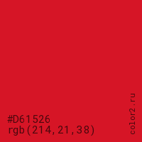 Цвет #D61526 в цветовой модели RGB обозначается тремя октетами (214, 21, 38) в десятичном формате и #D61526 в шестнадцатиричном (hex) формате, которые являются интенсивностью красного 214 (hex D6), интенсивность зелёного 21 (hex 15) и интенсивность синего 38 (hex 26).