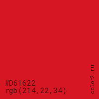 Цвет #D61622 в цветовой модели RGB обозначается тремя октетами (214, 22, 34) в десятичном формате и #D61622 в шестнадцатиричном (hex) формате, которые являются интенсивностью красного 214 (hex D6), интенсивность зелёного 22 (hex 16) и интенсивность синего 34 (hex 22).
