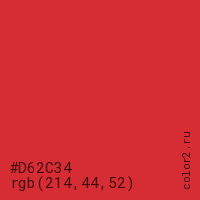Цвет #D62C34 в цветовой модели RGB обозначается тремя октетами (214, 44, 52) в десятичном формате и #D62C34 в шестнадцатиричном (hex) формате, которые являются интенсивностью красного 214 (hex D6), интенсивность зелёного 44 (hex 2C) и интенсивность синего 52 (hex 34).