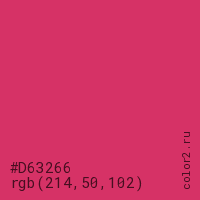 Цвет #D63266 в цветовой модели RGB обозначается тремя октетами (214, 50, 102) в десятичном формате и #D63266 в шестнадцатиричном (hex) формате, которые являются интенсивностью красного 214 (hex D6), интенсивность зелёного 50 (hex 32) и интенсивность синего 102 (hex 66).