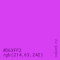 Цвет #D63FF2 в цветовой модели RGB обозначается тремя октетами (214, 63, 242) в десятичном формате и #D63FF2 в шестнадцатиричном (hex) формате, которые являются интенсивностью красного 214 (hex D6), интенсивность зелёного 63 (hex 3F) и интенсивность синего 242 (hex F2).