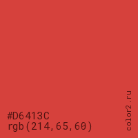 Цвет #D6413C в цветовой модели RGB обозначается тремя октетами (214, 65, 60) в десятичном формате и #D6413C в шестнадцатиричном (hex) формате, которые являются интенсивностью красного 214 (hex D6), интенсивность зелёного 65 (hex 41) и интенсивность синего 60 (hex 3C).