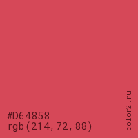 Цвет #D64858 в цветовой модели RGB обозначается тремя октетами (214, 72, 88) в десятичном формате и #D64858 в шестнадцатиричном (hex) формате, которые являются интенсивностью красного 214 (hex D6), интенсивность зелёного 72 (hex 48) и интенсивность синего 88 (hex 58).