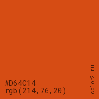 Цвет #D64C14 в цветовой модели RGB обозначается тремя октетами (214, 76, 20) в десятичном формате и #D64C14 в шестнадцатиричном (hex) формате, которые являются интенсивностью красного 214 (hex D6), интенсивность зелёного 76 (hex 4C) и интенсивность синего 20 (hex 14).