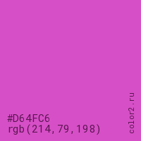 Цвет #D64FC6 в цветовой модели RGB обозначается тремя октетами (214, 79, 198) в десятичном формате и #D64FC6 в шестнадцатиричном (hex) формате, которые являются интенсивностью красного 214 (hex D6), интенсивность зелёного 79 (hex 4F) и интенсивность синего 198 (hex C6).