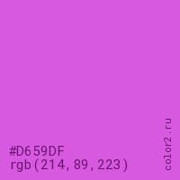 Цвет #D659DF в цветовой модели RGB обозначается тремя октетами (214, 89, 223) в десятичном формате и #D659DF в шестнадцатиричном (hex) формате, которые являются интенсивностью красного 214 (hex D6), интенсивность зелёного 89 (hex 59) и интенсивность синего 223 (hex DF).