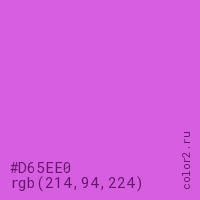 Цвет #D65EE0 в цветовой модели RGB обозначается тремя октетами (214, 94, 224) в десятичном формате и #D65EE0 в шестнадцатиричном (hex) формате, которые являются интенсивностью красного 214 (hex D6), интенсивность зелёного 94 (hex 5E) и интенсивность синего 224 (hex E0).