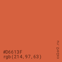 Цвет #D6613F в цветовой модели RGB обозначается тремя октетами (214, 97, 63) в десятичном формате и #D6613F в шестнадцатиричном (hex) формате, которые являются интенсивностью красного 214 (hex D6), интенсивность зелёного 97 (hex 61) и интенсивность синего 63 (hex 3F).