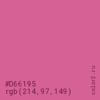 Цвет #D66195 в цветовой модели RGB обозначается тремя октетами (214, 97, 149) в десятичном формате и #D66195 в шестнадцатиричном (hex) формате, которые являются интенсивностью красного 214 (hex D6), интенсивность зелёного 97 (hex 61) и интенсивность синего 149 (hex 95).