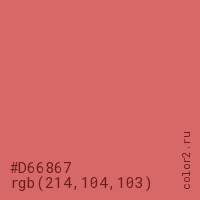 Цвет #D66867 в цветовой модели RGB обозначается тремя октетами (214, 104, 103) в десятичном формате и #D66867 в шестнадцатиричном (hex) формате, которые являются интенсивностью красного 214 (hex D6), интенсивность зелёного 104 (hex 68) и интенсивность синего 103 (hex 67).