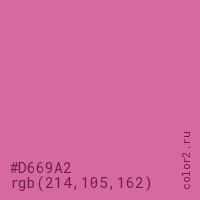 Цвет #D669A2 в цветовой модели RGB обозначается тремя октетами (214, 105, 162) в десятичном формате и #D669A2 в шестнадцатиричном (hex) формате, которые являются интенсивностью красного 214 (hex D6), интенсивность зелёного 105 (hex 69) и интенсивность синего 162 (hex A2).