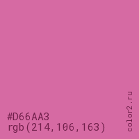 Цвет #D66AA3 в цветовой модели RGB обозначается тремя октетами (214, 106, 163) в десятичном формате и #D66AA3 в шестнадцатиричном (hex) формате, которые являются интенсивностью красного 214 (hex D6), интенсивность зелёного 106 (hex 6A) и интенсивность синего 163 (hex A3).