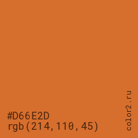 Цвет #D66E2D в цветовой модели RGB обозначается тремя октетами (214, 110, 45) в десятичном формате и #D66E2D в шестнадцатиричном (hex) формате, которые являются интенсивностью красного 214 (hex D6), интенсивность зелёного 110 (hex 6E) и интенсивность синего 45 (hex 2D).