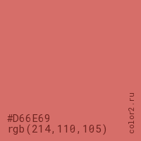 Цвет #D66E69 в цветовой модели RGB обозначается тремя октетами (214, 110, 105) в десятичном формате и #D66E69 в шестнадцатиричном (hex) формате, которые являются интенсивностью красного 214 (hex D6), интенсивность зелёного 110 (hex 6E) и интенсивность синего 105 (hex 69).