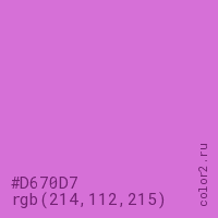 Цвет #D670D7 в цветовой модели RGB обозначается тремя октетами (214, 112, 215) в десятичном формате и #D670D7 в шестнадцатиричном (hex) формате, которые являются интенсивностью красного 214 (hex D6), интенсивность зелёного 112 (hex 70) и интенсивность синего 215 (hex D7).