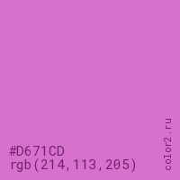 Цвет #D671CD в цветовой модели RGB обозначается тремя октетами (214, 113, 205) в десятичном формате и #D671CD в шестнадцатиричном (hex) формате, которые являются интенсивностью красного 214 (hex D6), интенсивность зелёного 113 (hex 71) и интенсивность синего 205 (hex CD).