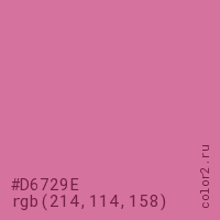 Цвет #D6729E в цветовой модели RGB обозначается тремя октетами (214, 114, 158) в десятичном формате и #D6729E в шестнадцатиричном (hex) формате, которые являются интенсивностью красного 214 (hex D6), интенсивность зелёного 114 (hex 72) и интенсивность синего 158 (hex 9E).