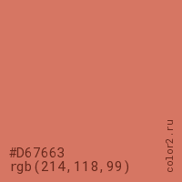 Цвет #D67663 в цветовой модели RGB обозначается тремя октетами (214, 118, 99) в десятичном формате и #D67663 в шестнадцатиричном (hex) формате, которые являются интенсивностью красного 214 (hex D6), интенсивность зелёного 118 (hex 76) и интенсивность синего 99 (hex 63).