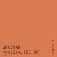 Цвет #D67B50 в цветовой модели RGB обозначается тремя октетами (214, 123, 80) в десятичном формате и #D67B50 в шестнадцатиричном (hex) формате, которые являются интенсивностью красного 214 (hex D6), интенсивность зелёного 123 (hex 7B) и интенсивность синего 80 (hex 50).