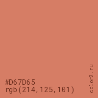 Цвет #D67D65 в цветовой модели RGB обозначается тремя октетами (214, 125, 101) в десятичном формате и #D67D65 в шестнадцатиричном (hex) формате, которые являются интенсивностью красного 214 (hex D6), интенсивность зелёного 125 (hex 7D) и интенсивность синего 101 (hex 65).