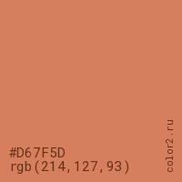 Цвет #D67F5D в цветовой модели RGB обозначается тремя октетами (214, 127, 93) в десятичном формате и #D67F5D в шестнадцатиричном (hex) формате, которые являются интенсивностью красного 214 (hex D6), интенсивность зелёного 127 (hex 7F) и интенсивность синего 93 (hex 5D).