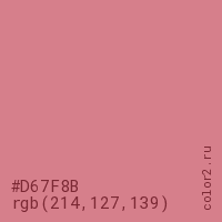 Цвет #D67F8B в цветовой модели RGB обозначается тремя октетами (214, 127, 139) в десятичном формате и #D67F8B в шестнадцатиричном (hex) формате, которые являются интенсивностью красного 214 (hex D6), интенсивность зелёного 127 (hex 7F) и интенсивность синего 139 (hex 8B).